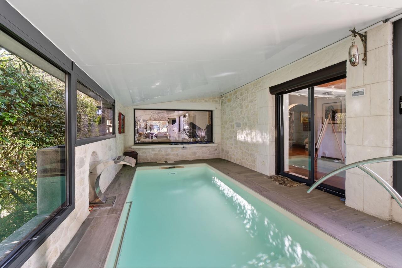 La villa propose également un véritable espace bien-être avec une piscine intérieure et un espace jacuzzi, permettant de profiter de moments de détente tout au long de l’année.