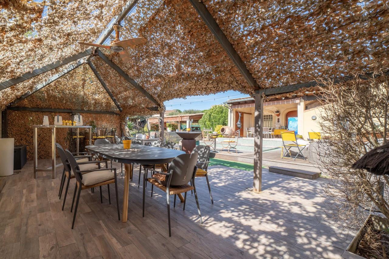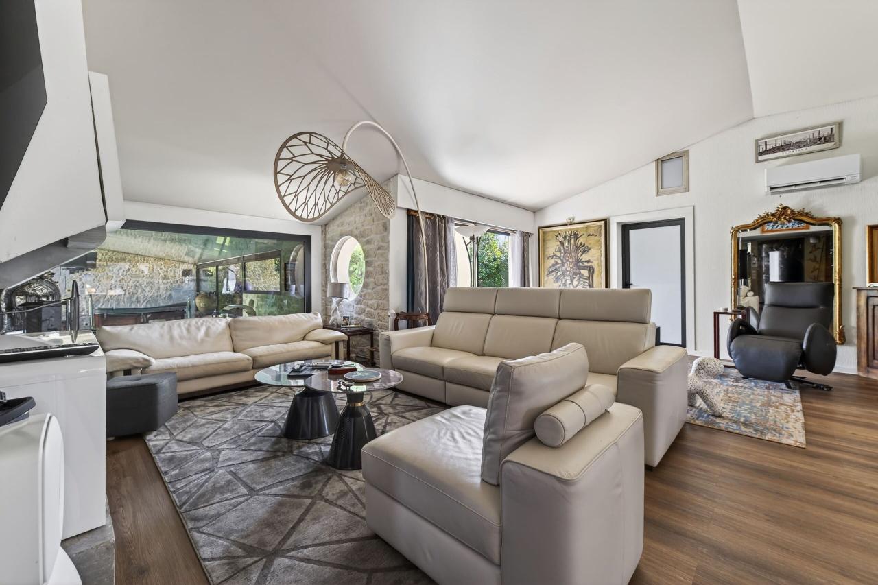 À l’extérieur, les espaces ont été aménagés pour profiter pleinement du cadre de vie : terrasses conviviales, jardin paysager et une seconde piscine parfaitement intégrée.
