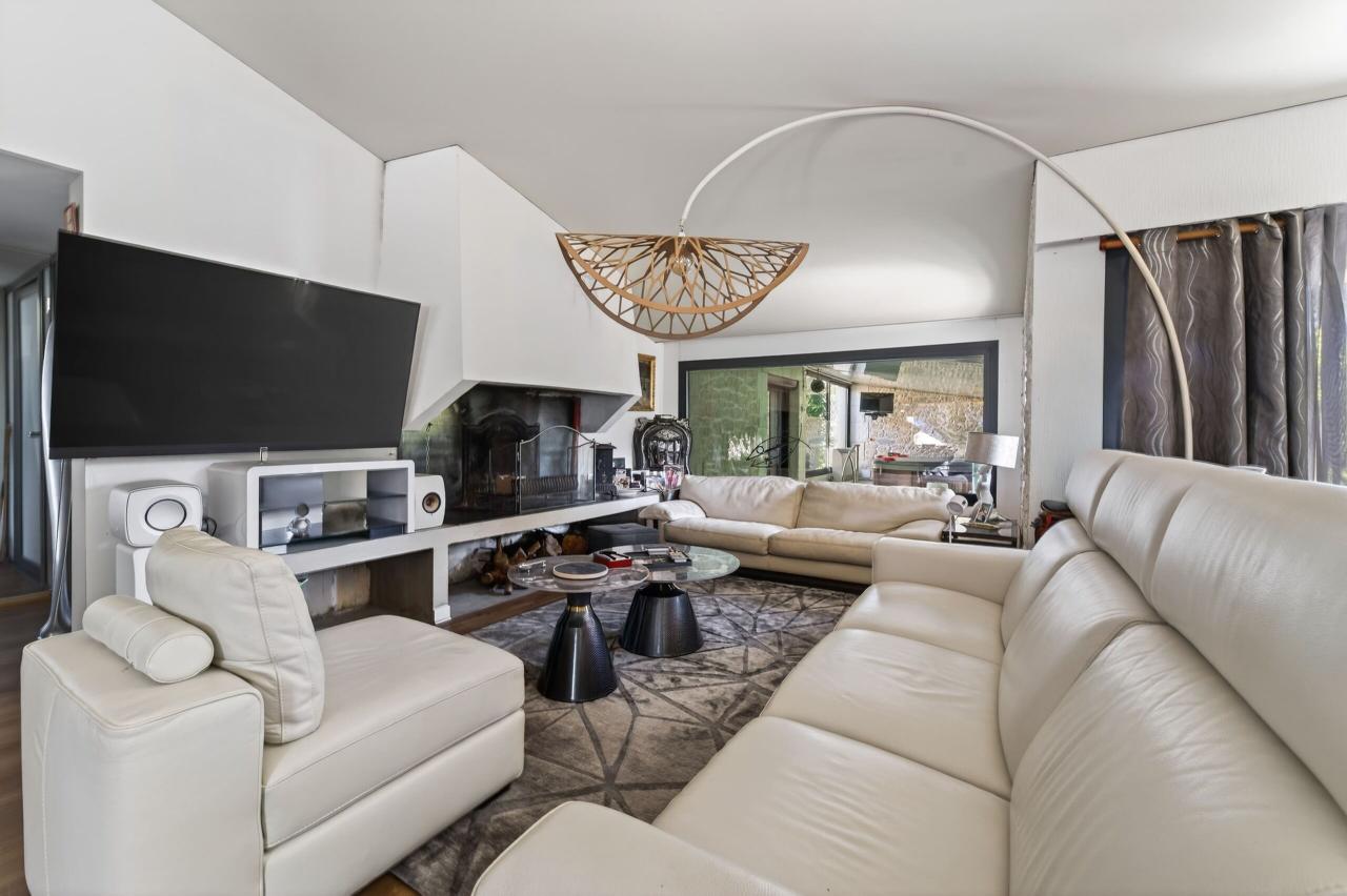 La pièce de vie d’environ 100 m² constitue le cœur de la maison : un espace chaleureux réunissant un salon avec cheminée, une salle à manger conviviale et une cuisine ouverte entièrement équipée, le tout prolongé par de larges ouvertures sur les terrasses et le jardin.