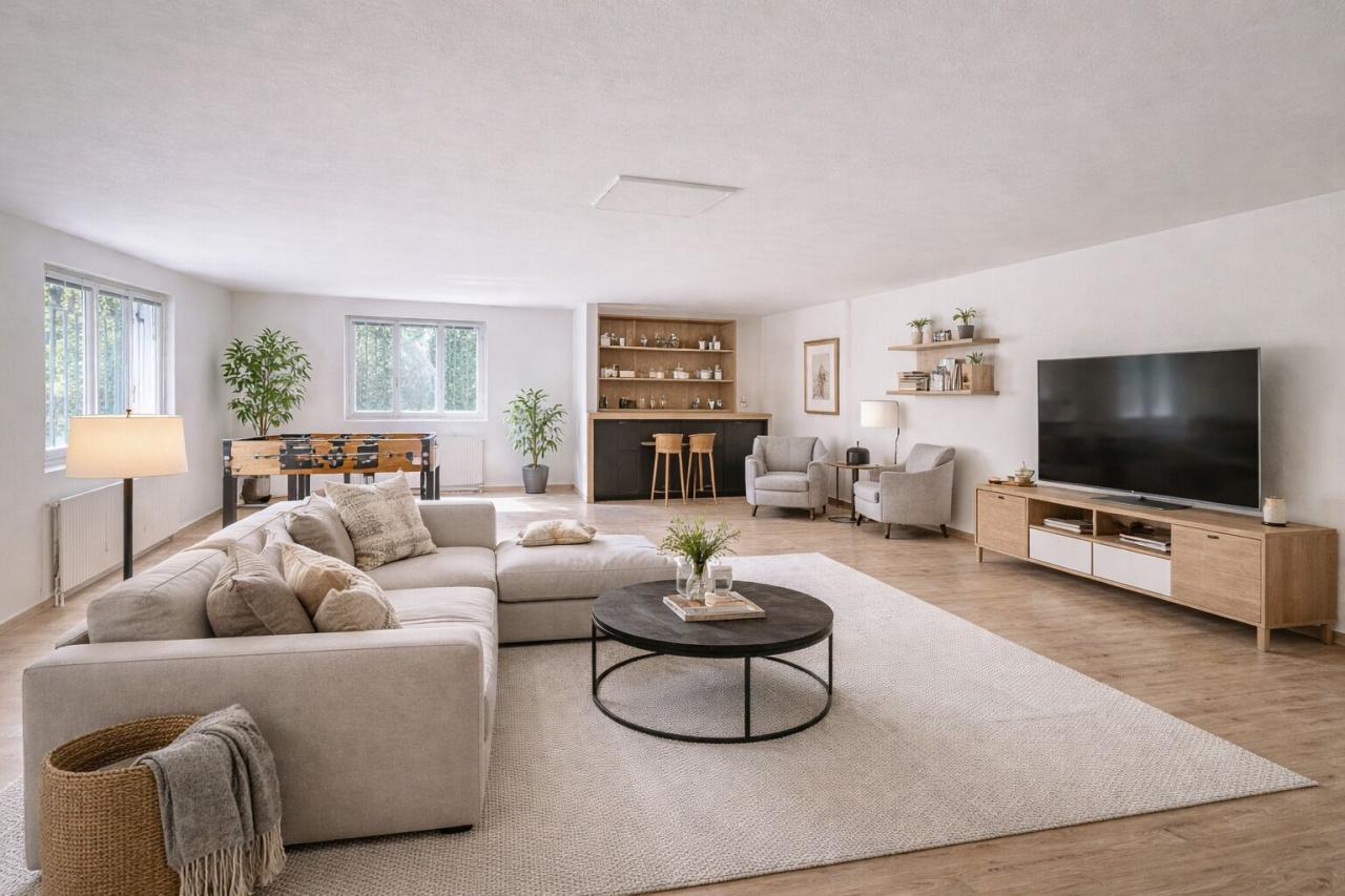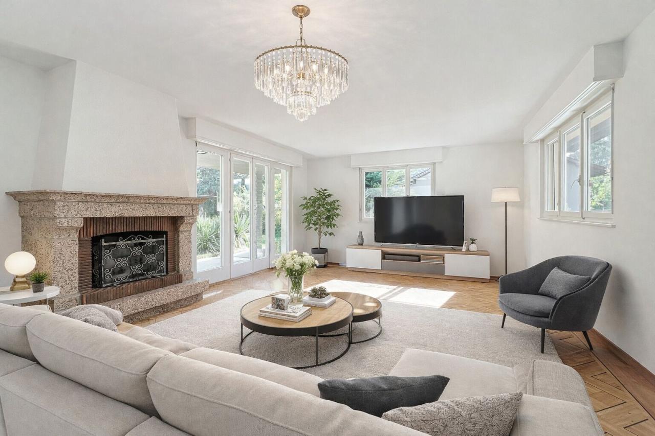 Un grand jardin, des espaces de vie lumineux et une pièce exceptionnelle au rez inférieur font de cette propriété un bien rare sur le marché de Cointrin.