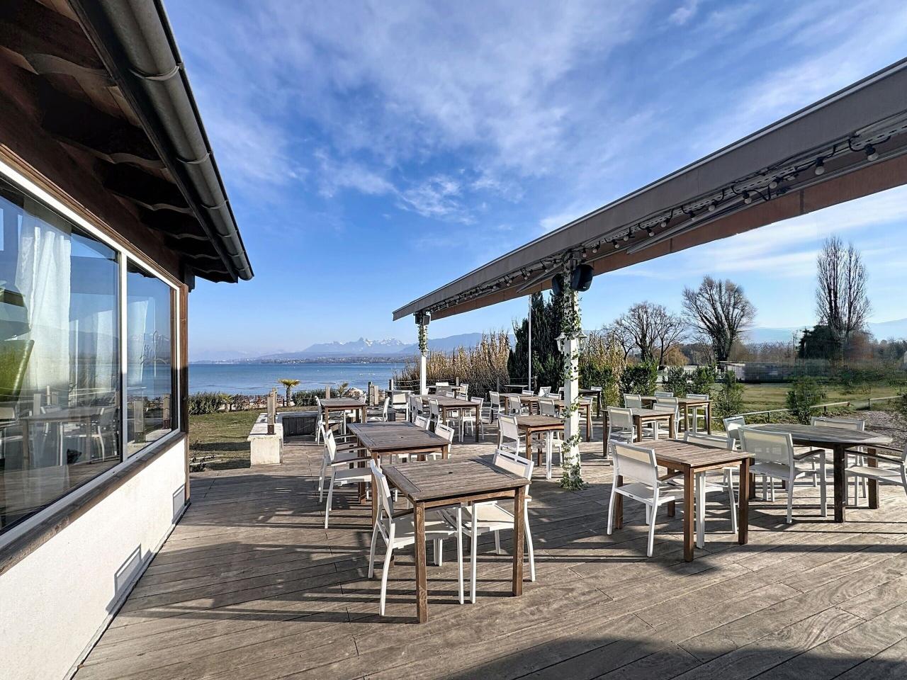 Espaces commerciaux : bar, salle de restauration, véranda lumineuse et grande terrasse.